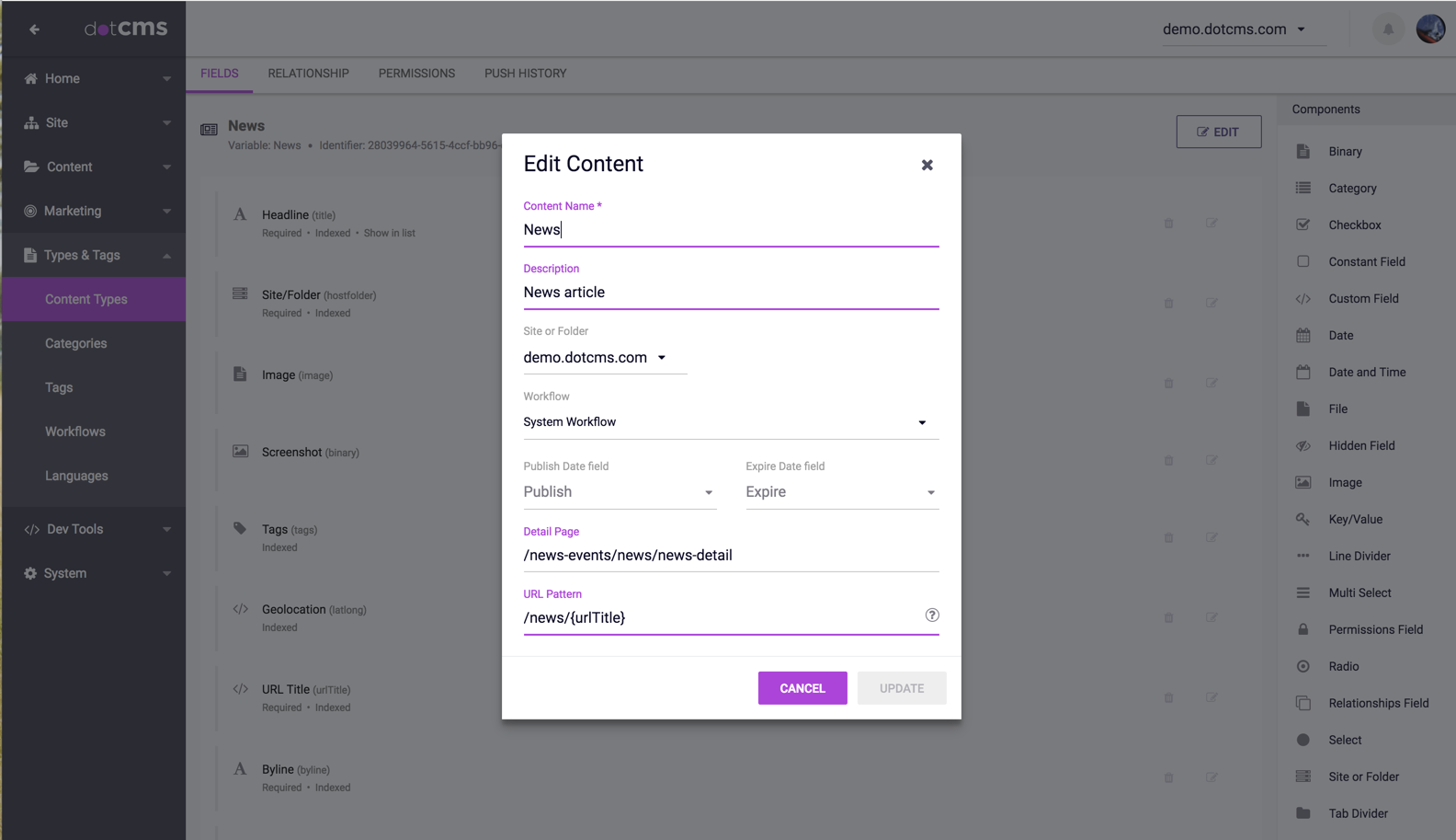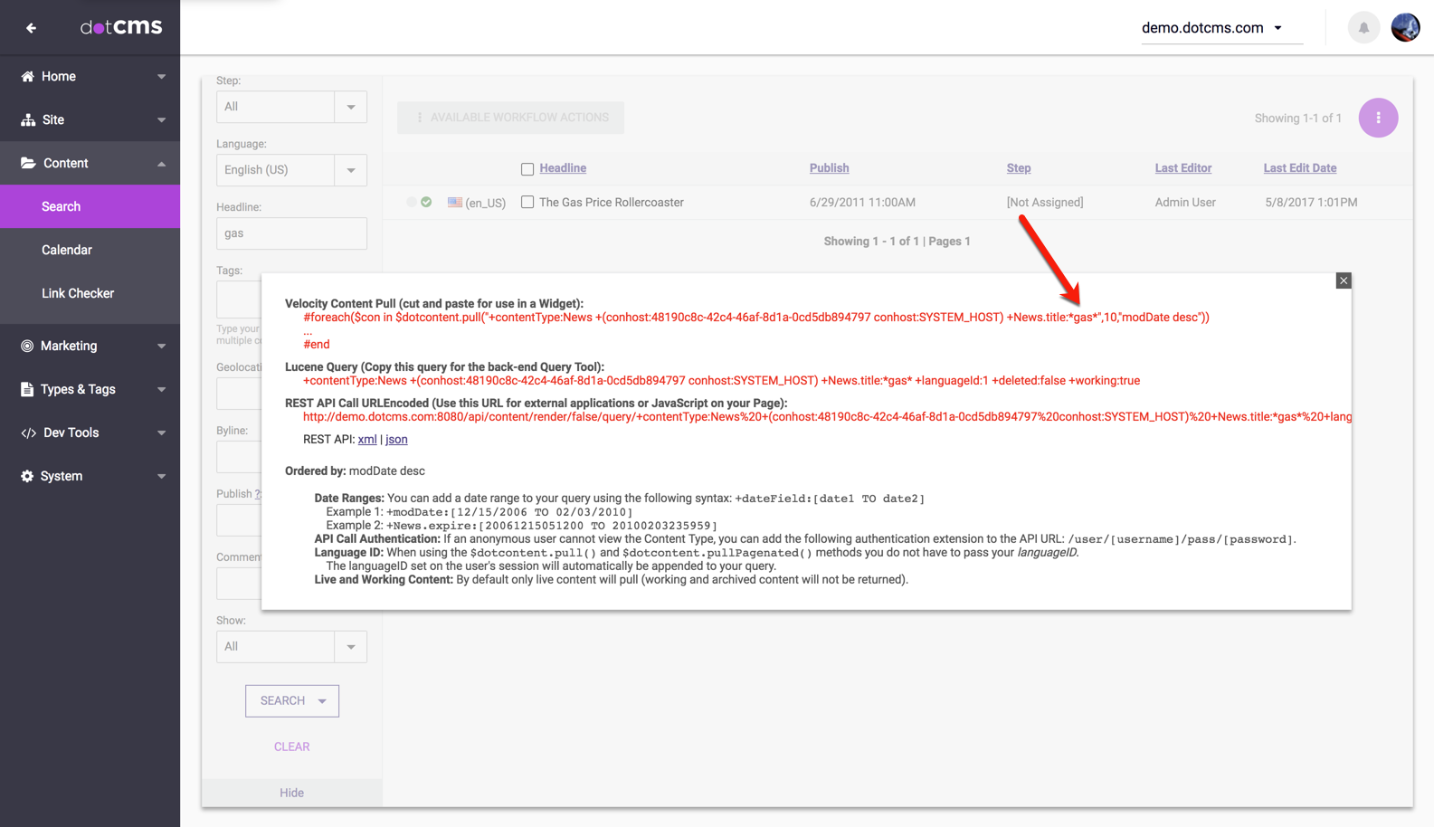 The dotCMS starter site (and the dotCMS demo site) contain a News Content Type which has the following searchable or indexed fields: