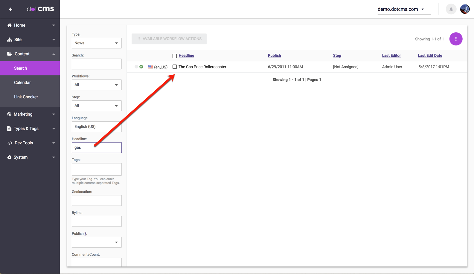 When you perform a search in the Content tab for News content with the word "gas" in the Headline field only, you receive only one result: