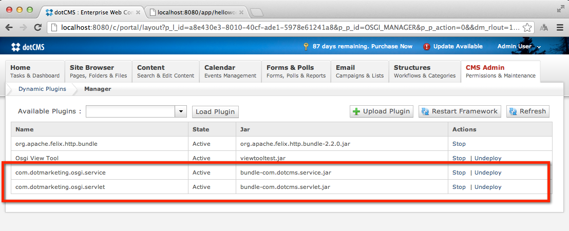 - Therefore the com.dotcms.service plugin must be installed and loaded before you can build this plugin.