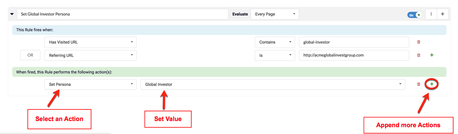 Shown below is an example of the "Set Persona" Action that sets a visitor "Persona" type, based on custom Ruleset Conditions: