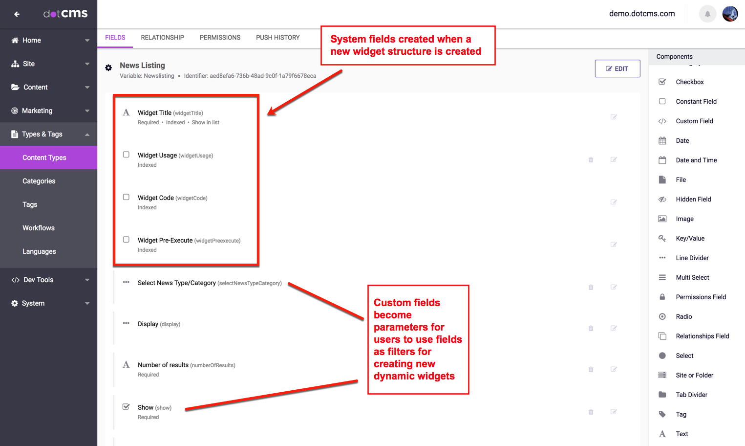For example, if pages need to be created for many departments — or organizations, or other target group — listing news relevant to each, then a Widget Type could be created and all the variations for each department could be accounted for as fields in the Widget Type. Content contributors within each department could then simply customize their own news pull simply by using checkboxes, select boxes, radio buttons, categories, etc., to customize a dynamic pull of news in the form of a widget.