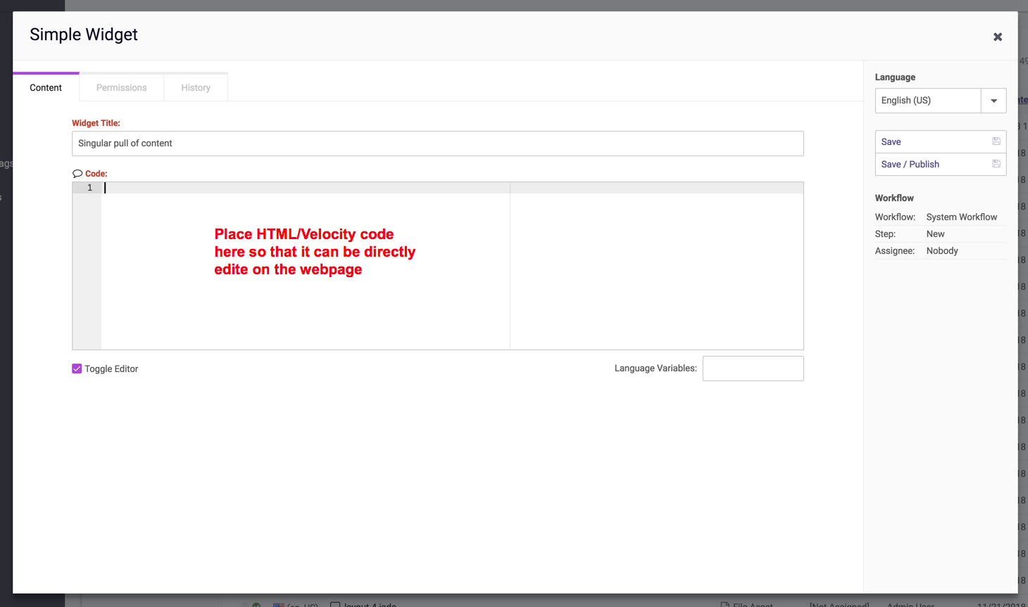 Simple widgets expose the their dynamic code field for editing directly from the "Edit Widget" link on an HTML page.