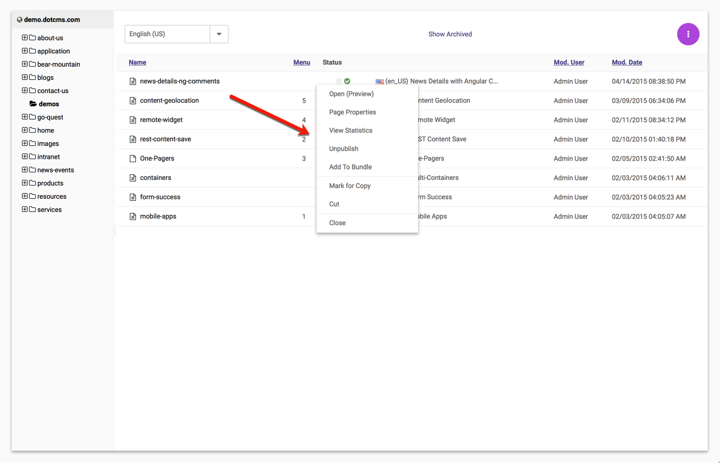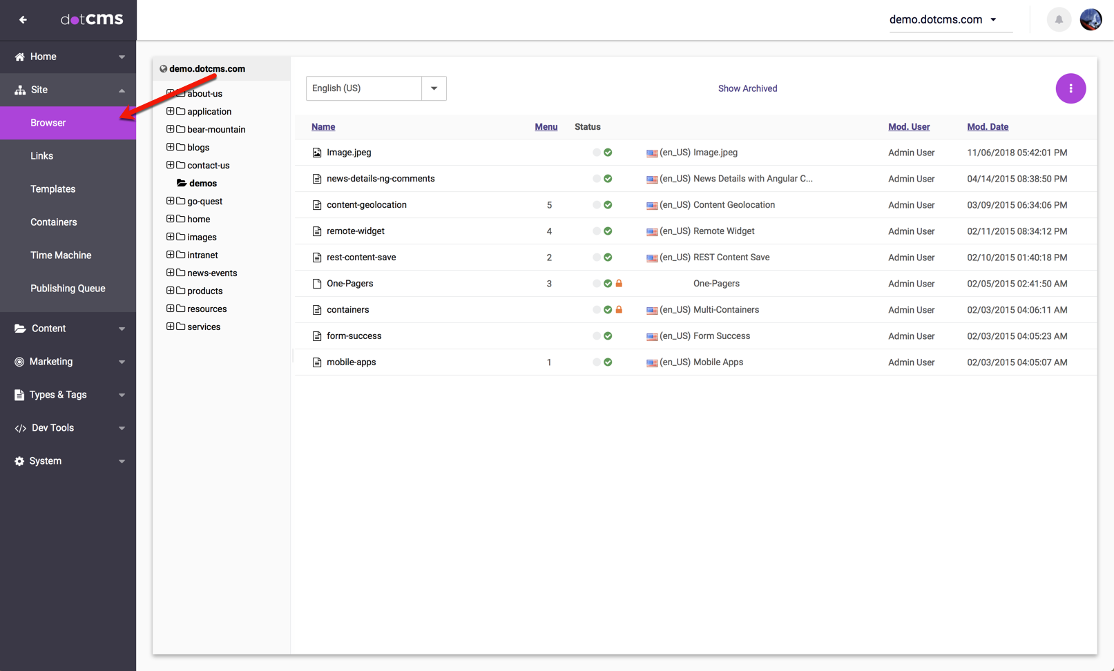The Show Archived button can be toggled on and off to view archived File Assets and Pages. If a File Asset, Page or folder is accidentally archived, clicking Show Archived will reveal them so they can be unarchived. It is recommended that you routinely remove older archived objects from a dotCMS. For more information on these cleanup tasks and how to automate them, please see the Backend Maintenance Tasks documentation.