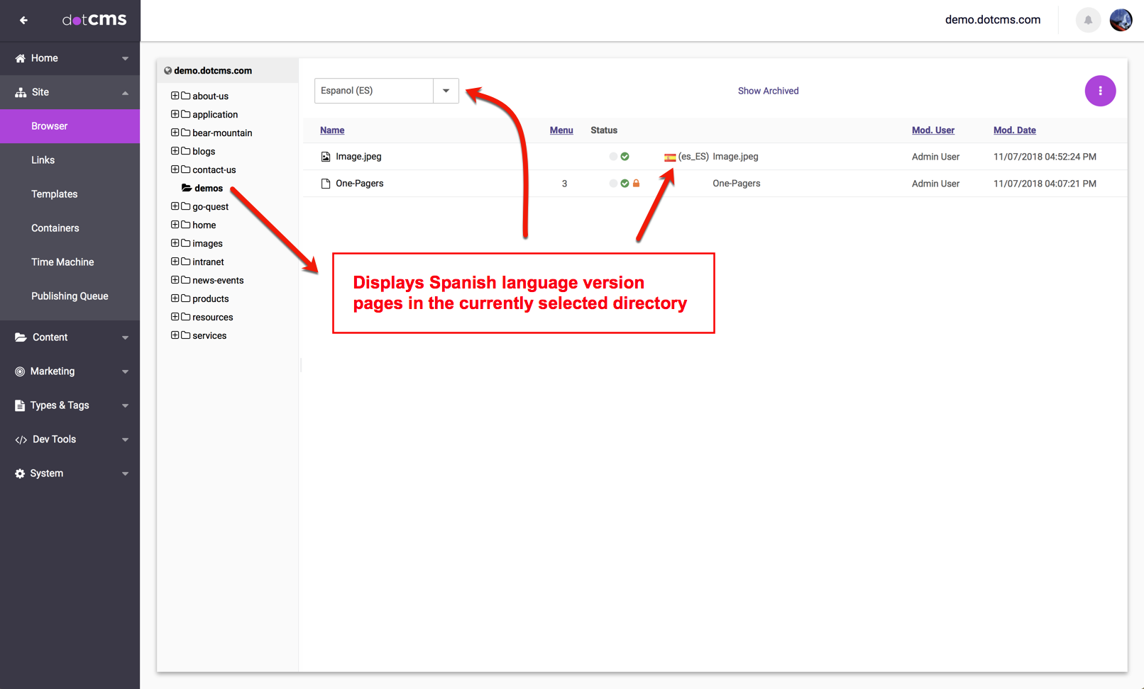 Pages, File Assets, and content of all Content Types can be created in multiple language versions. To view the contents of Sites or Folders by language version, click the language drop down menu: