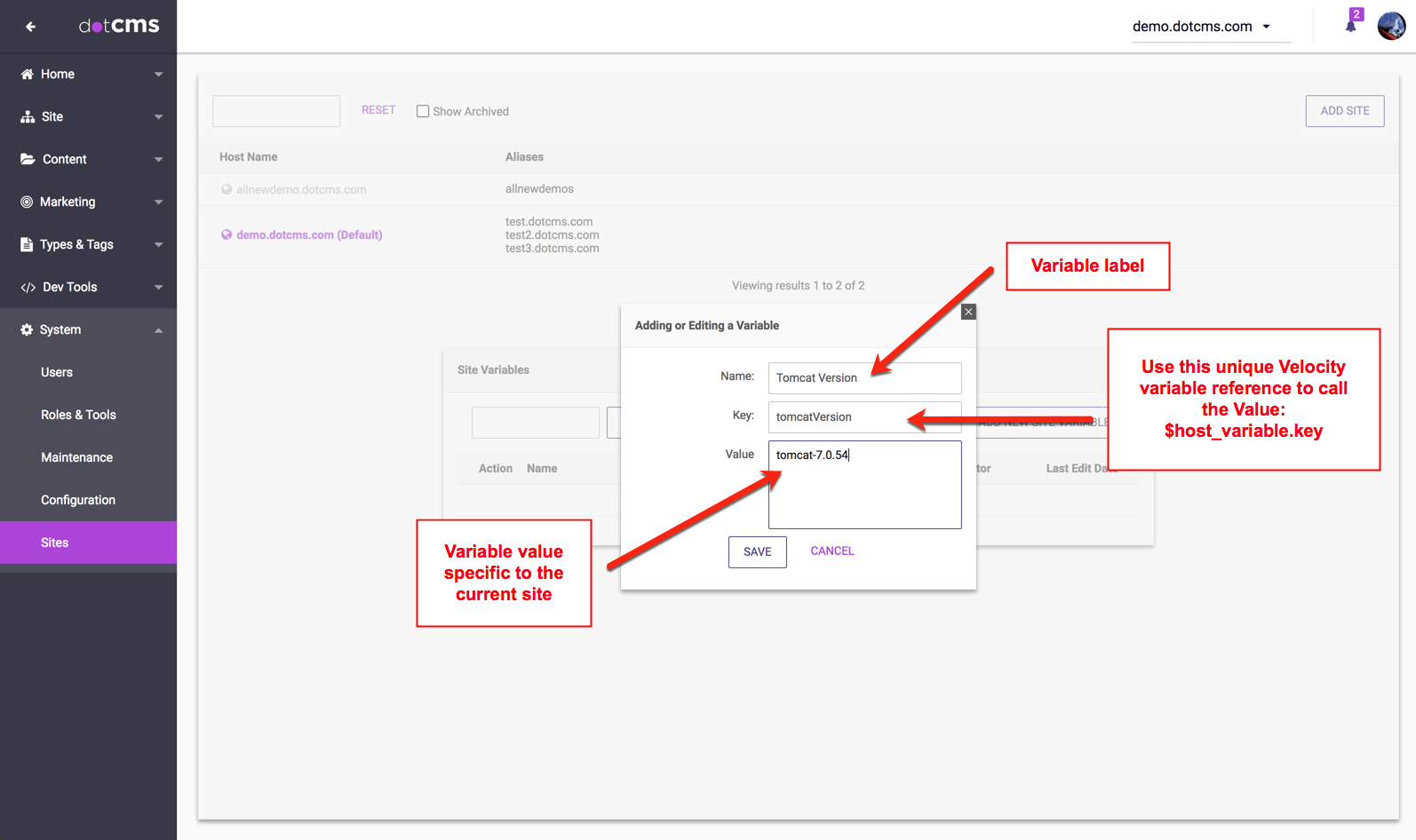 - Since site variables are intentionally not saved with the site itself, it may be necessary to flush the server cache before you can access the new site variable from your Velocity code.