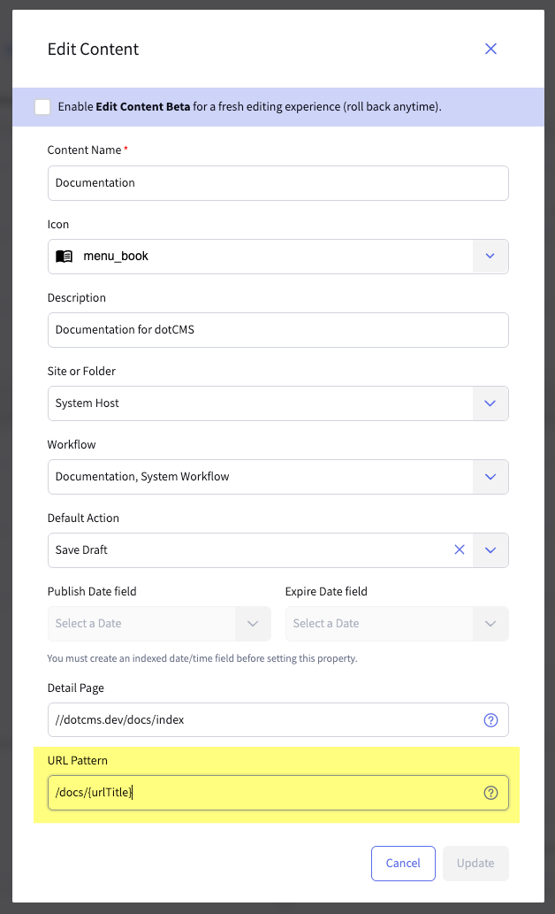 - Next, when defining the Content Type's detail page, include a Site in the path. For example: //dotcms.com/documentation/index