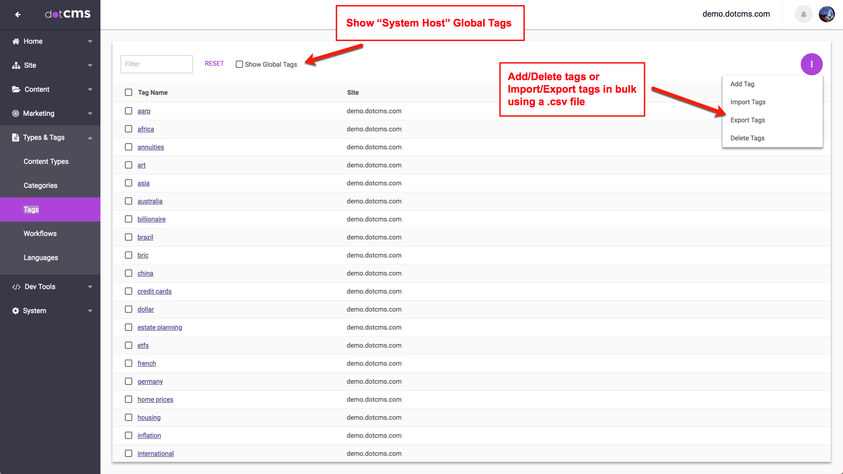 Tag Repositories are collections of Tags that are used by one or more Hosts. Tag Repositories enable multi-tenant dotCMS installations to ensure that, when content contributors add content with a Tag field, they are not overwhelmed with suggested Tags from all hosts managed by a dotCMS instance.