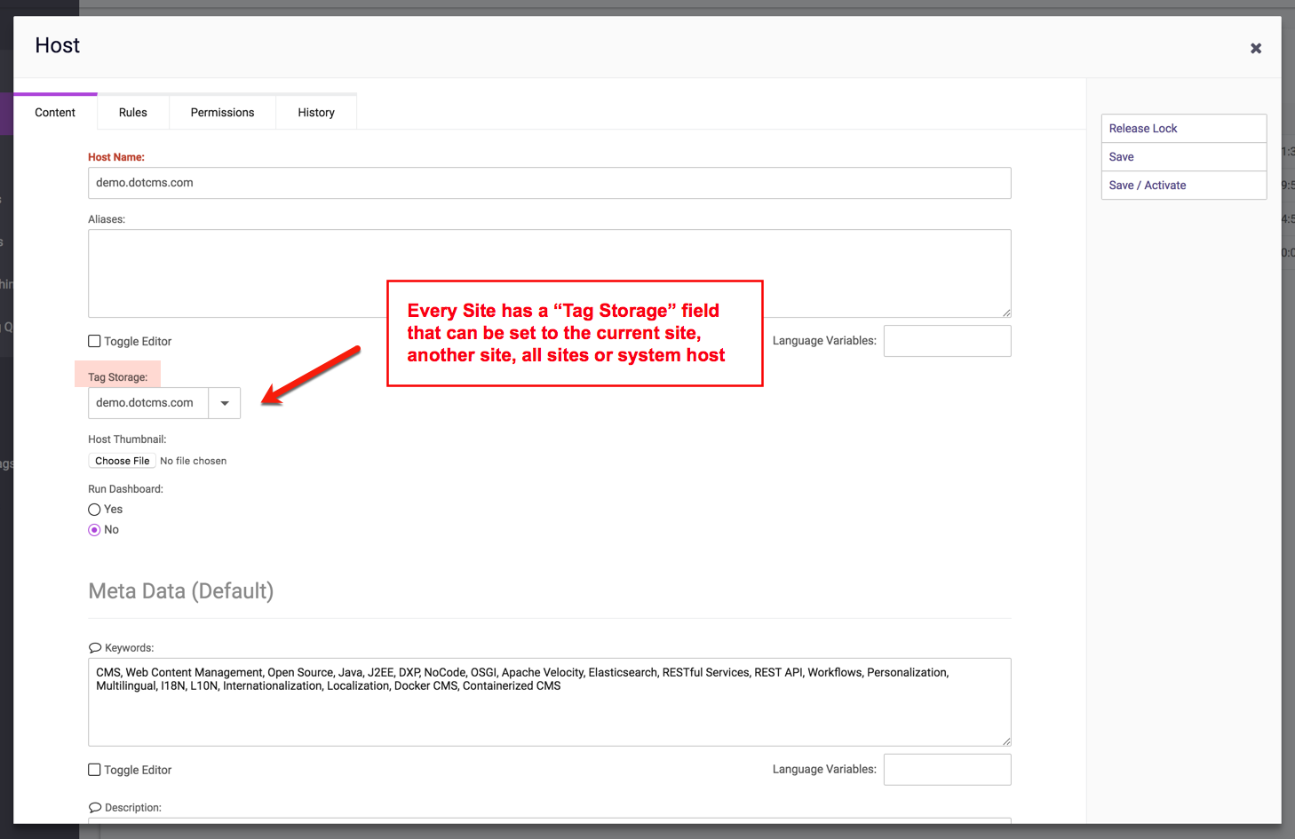 - When the Content Type Host or Folder field) is set to a second Host, the both the Content and Tags for that content are stored on the second Host.