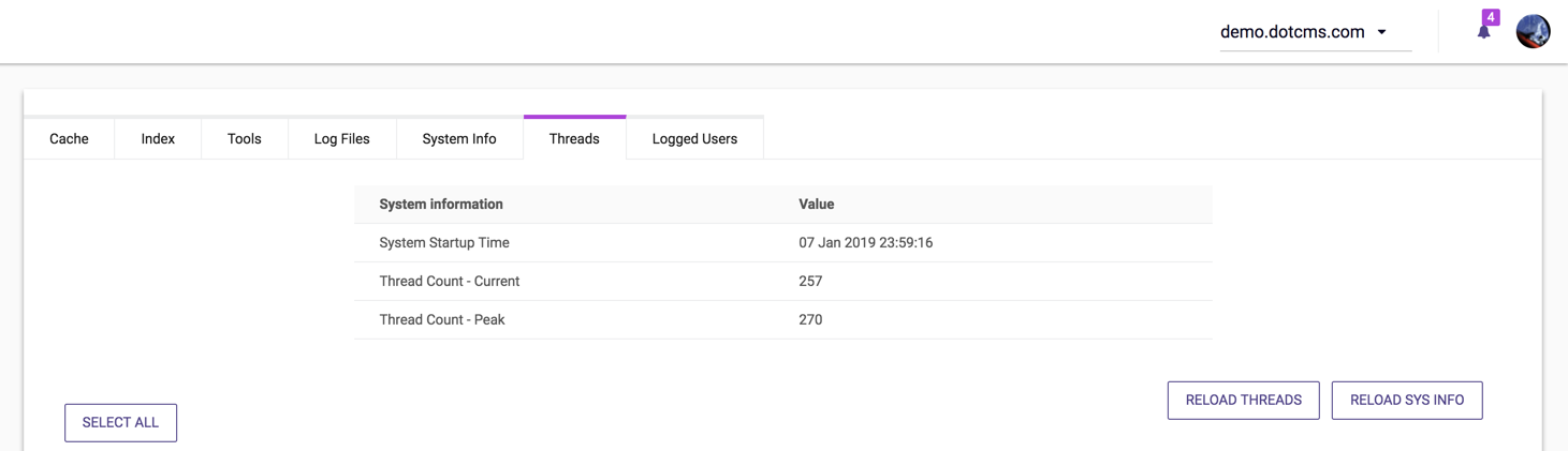 You may wish to save the detailed thread information; for example, dotCMS support may request this information when helping you with some specific issues. To copy the detailed thread information, press the Select all button and then copy the information from your browser; you can then paste the thread information into a file or another window.