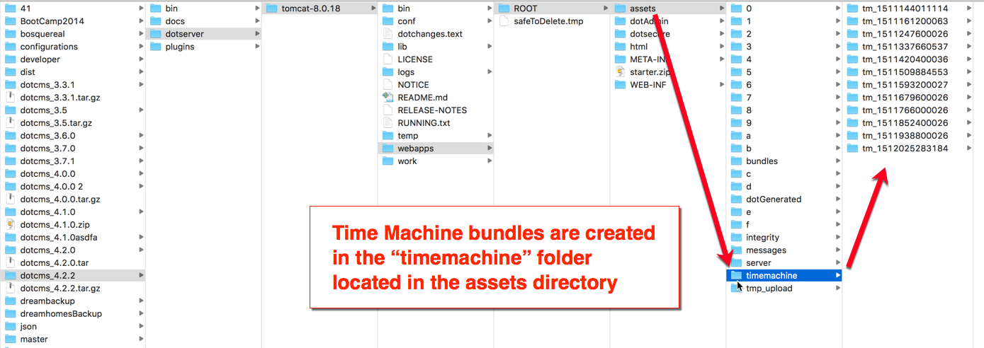 When you create a Time Machine Snapshots, dotCMS creates copies of all your site content and assets at the time the snapshot is taken. These copies are stored as files that are saved in the timemachine subfolder within the assets folder. In addition, while the Time Machine Job is running, a temporary copy of each snapshot is temporarily saved in the bundles subfolder (within the assets folder).