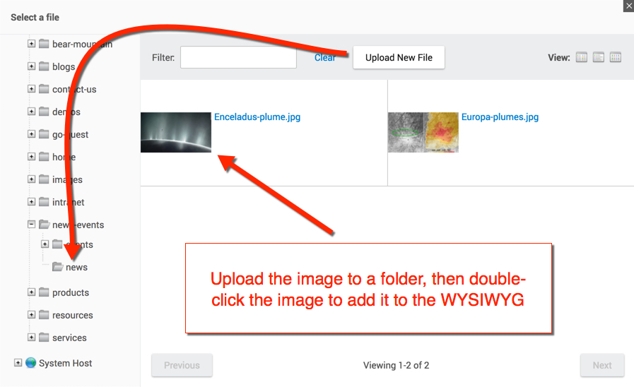 - After clicking on a specific folder, you will see the thumbnails of images in that folder. You can user the "Filter" keyword search box to find a specific image by title.