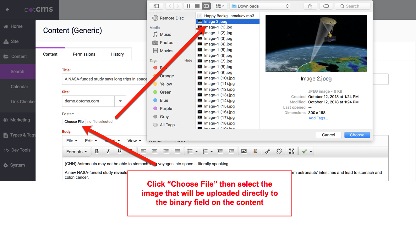Images can be uploaded as files and linked to the content via an image field. The image below shows an image field being used to browse for and upload an image file to dotCMS.