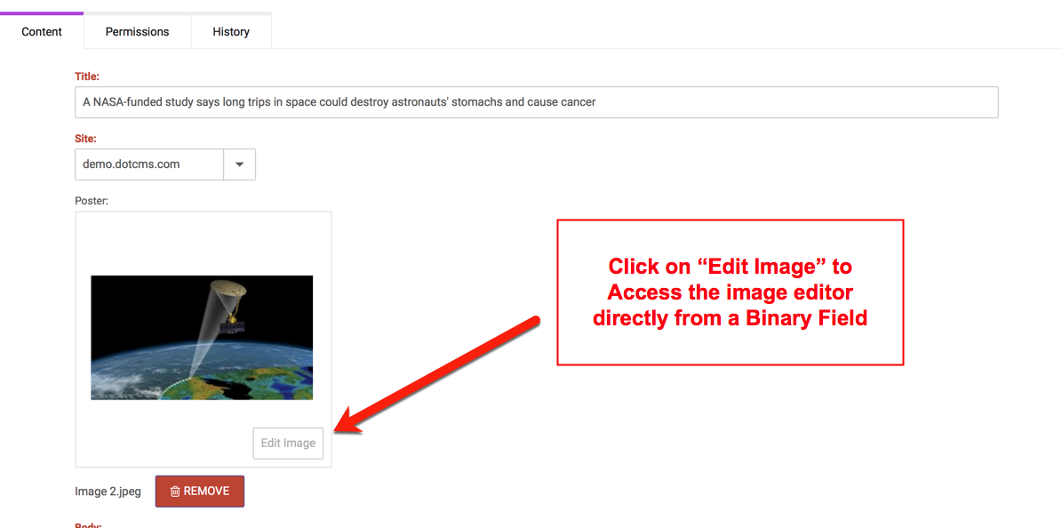 Images uploaded directly into content via binary fields can be edited direclty using the image editor feature.