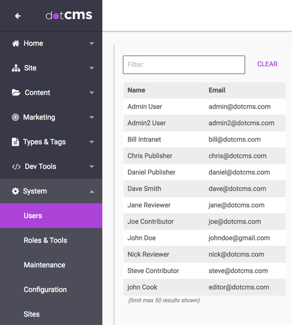 Every User in dotCMS can be configured as a Front-end user and/or Back-end user. Front-end users may submit content via forms on the front-end of your site. Back-end users may login to the dotCMS back-end.