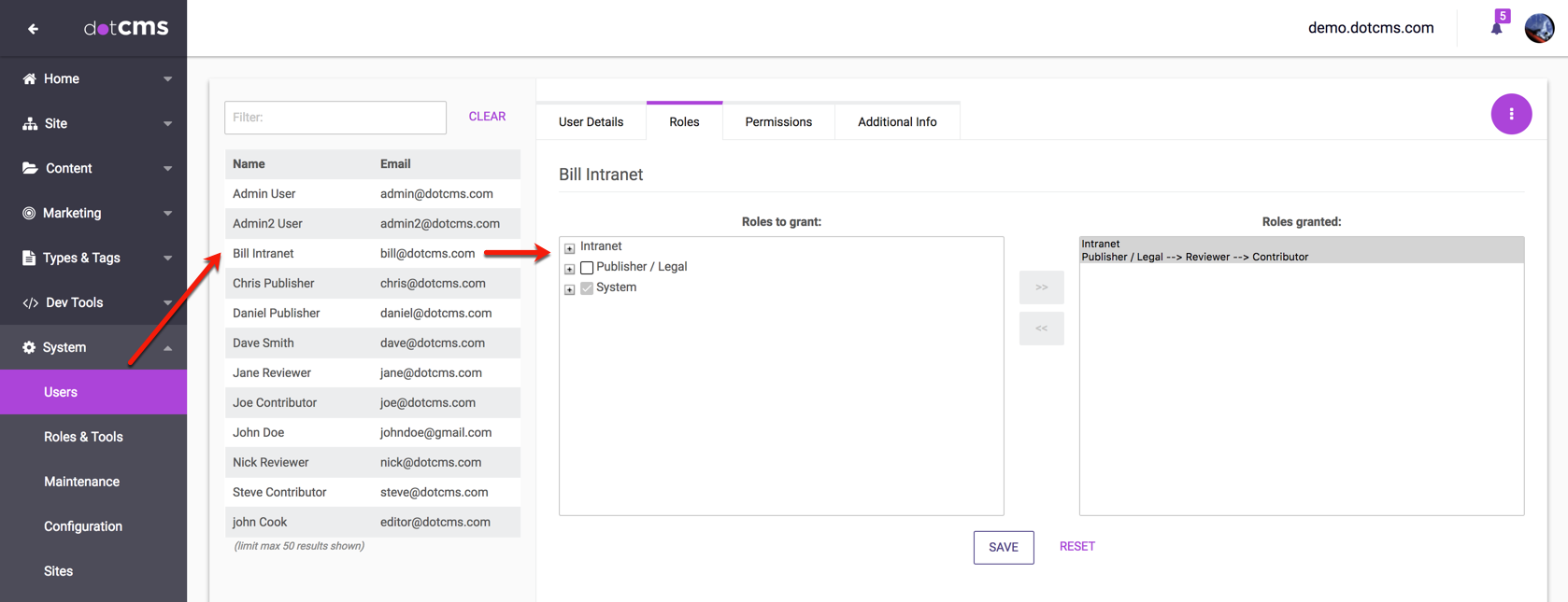 dotCMS objects can be permissioned directly to a user as well as receiving role based object permissions. Large groups of similarly permissioned users can all be easily assigned to the same role, however if a few users in that group need additional access to a few objects, permissions can be quickly extended to those unique users without affecting role distribution.
