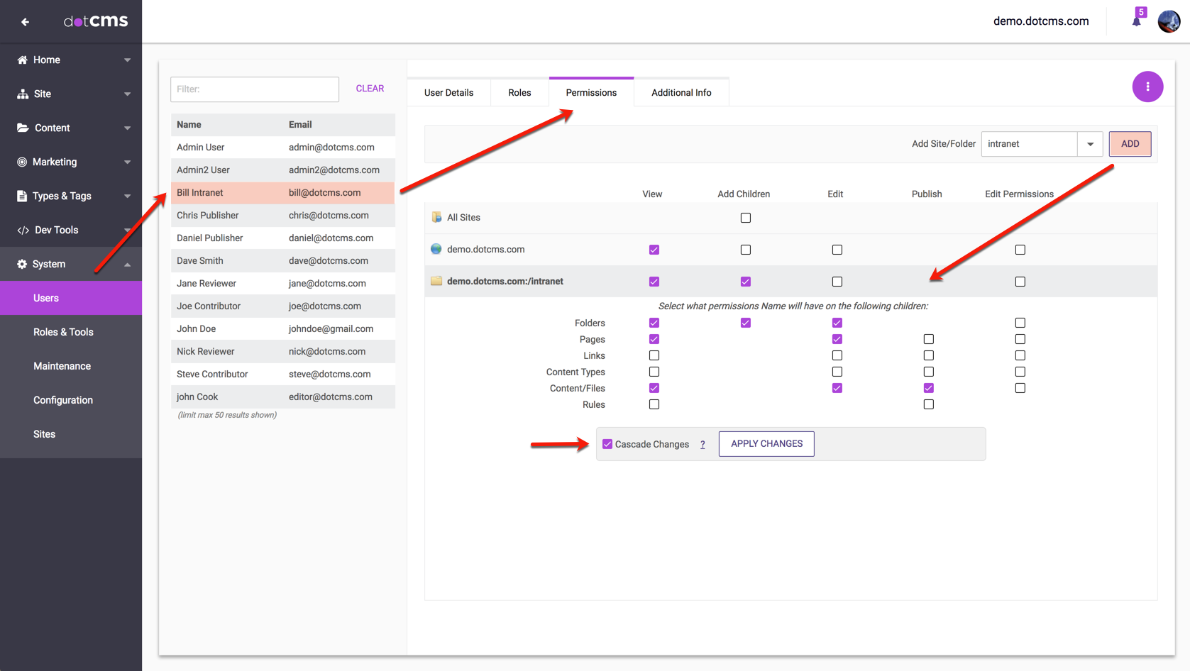 In the following example, User "John Cook" has already been assigned the "Content Publisher" Role which gives this user permission to add, edit, and publish content. In addition, this user has been given "View" and "Edit" rights to all Templates and Containers on the the System Host - which will allow him to view and edit all Templates and Containers that inherit permissions from the System Host.