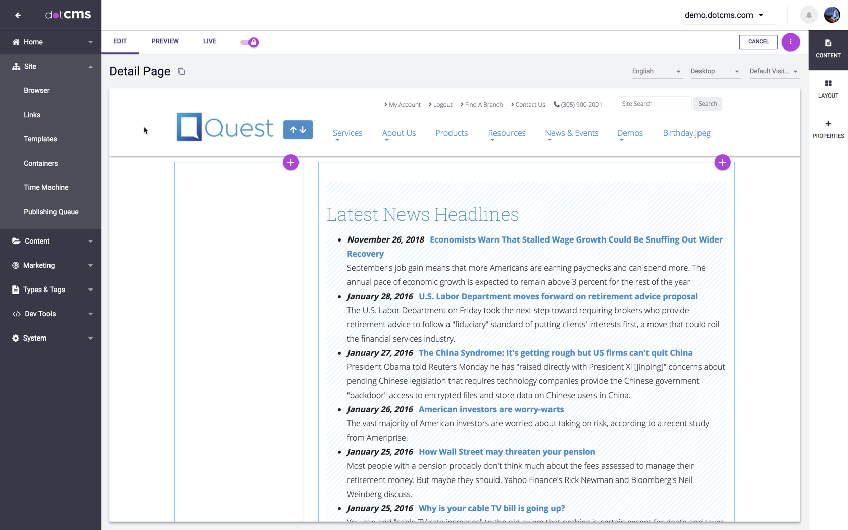 For this example, we will use the Quest - 2 Column (w/ Side Nav) Template included in the dotCMS starter site.
