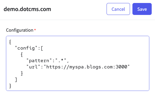 { "config":[ { "pattern":"/blogs/(.*)", "url":"https://myspa.blogs.com:3000" }, { "pattern":".*", "url":"https://myspa.com:3000", "options": { "allowedDevURLs": [ "http://localhost:3000", "http://localhost:3001", "https://myspa.dev.com" ] } } ] }