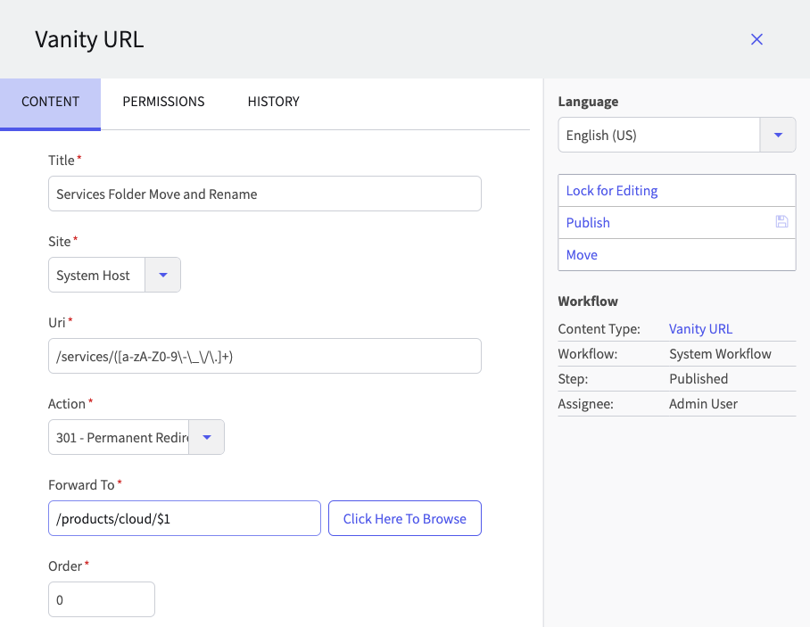 For example, you may create a Vanity URL without a regular expression to redirect a specific page, but have another Vanity URL which uses a regular expression to redirect all pages within the same folder that the redirected page used to be located in.