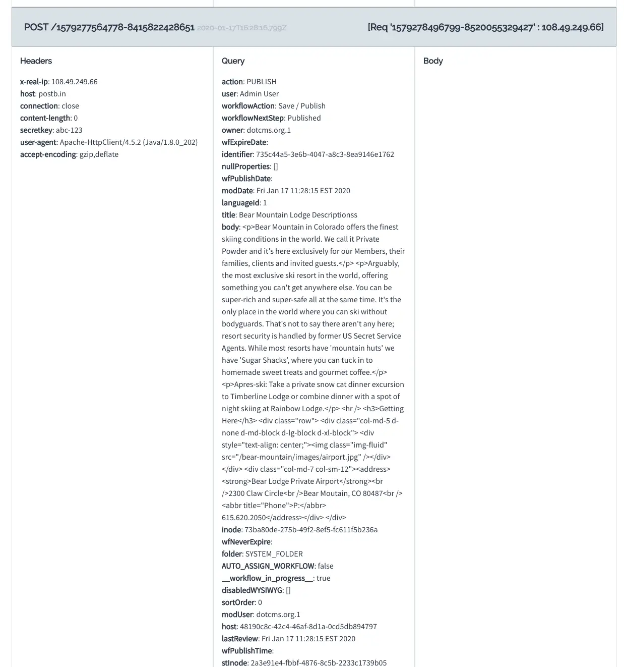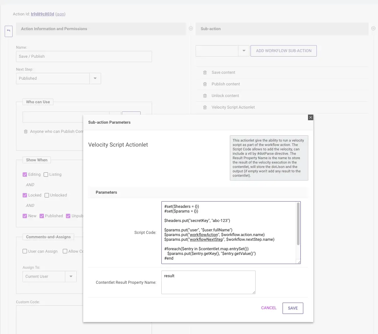 - Set the "Script Code" property to the following: #set($headers = {}) #set($params = {}) $headers.put("secretKey", "abc-123") $params.put("userName", "$user.fullName") $params.put("workflowAction", $workflow.action.name) $params.put("workflowNextStep", $workflow.nextStep.name) #foreach($entry in $contentlet.map.entrySet()) $params.put($entry.getKey(), "$entry.getValue()") #end $json.put("https://postb.in/[YOUR_POSTBIN_ID]", $headers, $params)